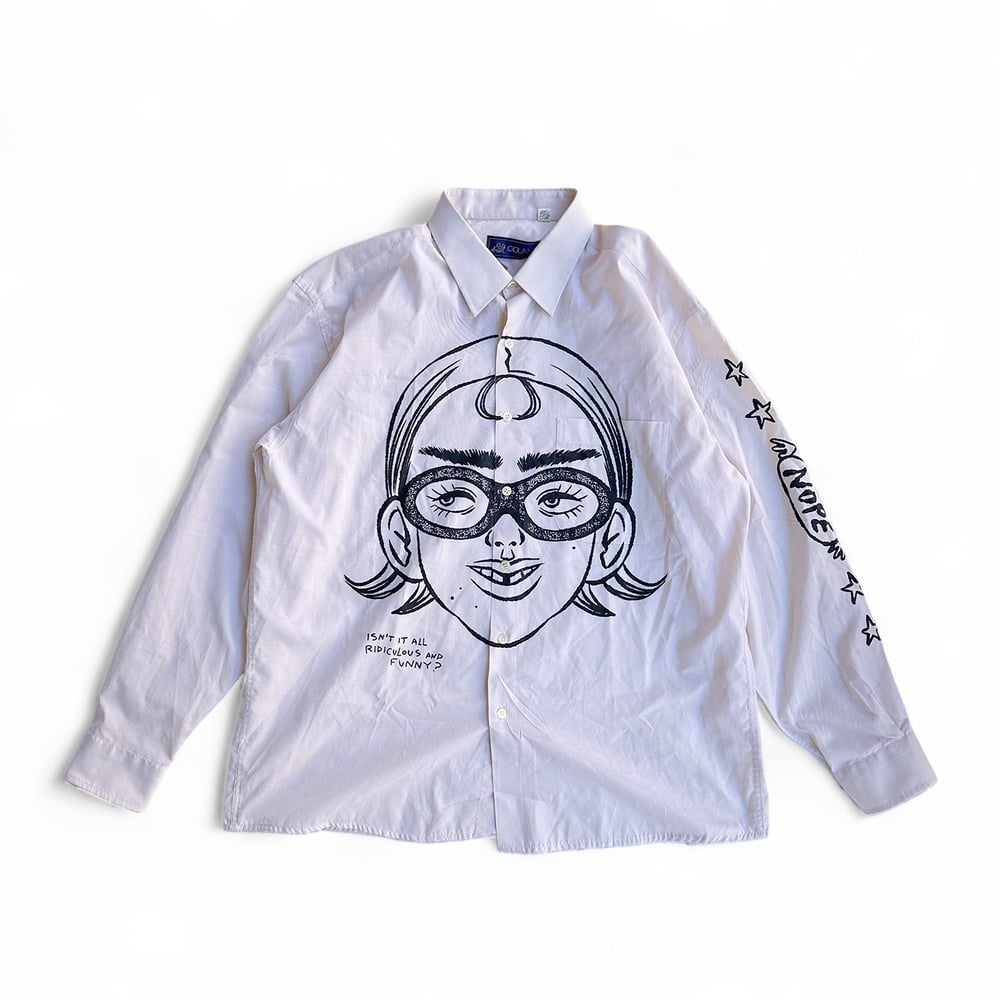 Camisas de segunda mano con ilustración serigrafiada. Diseñadas por Núria Just y serigrafiadas a mano por Máquina Total. Perfectas para overlaying.
